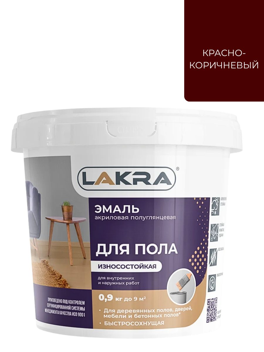 Эмаль акриловая для пола красно-коричневая 0,9кг Лакра применяется для для окраски деревянных полов внутри и снаружи помещений и бетонных полов внутри бытовых помещений. Может применяться для окраски дверей, мебели и др. поверхностей. Высококачественная водоразбавляемая эмаль на основе акриловой дисперсии. Быстро высыхает. Образует полуглянцевую поверхность, стойкую к механическим воздействиям, влаге и истиранию. Отличается высокими декоративными и защитными свойствами, стойкая к мытью. Готова к