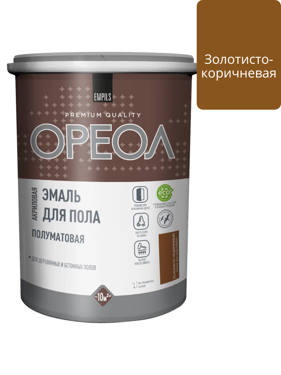 Эмаль акриловая для пола полуматовая золотисто-коричневая 0,9кг ОРЕОЛ применяется для окрашивания деревянных и бетонных полов в бытовых помещениях. Может применяться для окраски стен, дверей, мебели и других поверхностей, не подверженных плотному соприкосновению. Эмаль готова к применению. Не имеет резкого запаха. Быстро сохнет. Отличается высокой укрывистостью и адгезией к дереву и минеральным основаниям. Покрытие эмали устойчиво к воздействию бытовых моющих средств, обладает высокими декоративными и защитными свойствами, образует поверхность, стойкую к механическому воздействию (удару, царапинам, сколам), влаге и истиранию. Допускается нанесение внутри и снаружи (защищенных от прямых атмосферных воздействий) помещений.