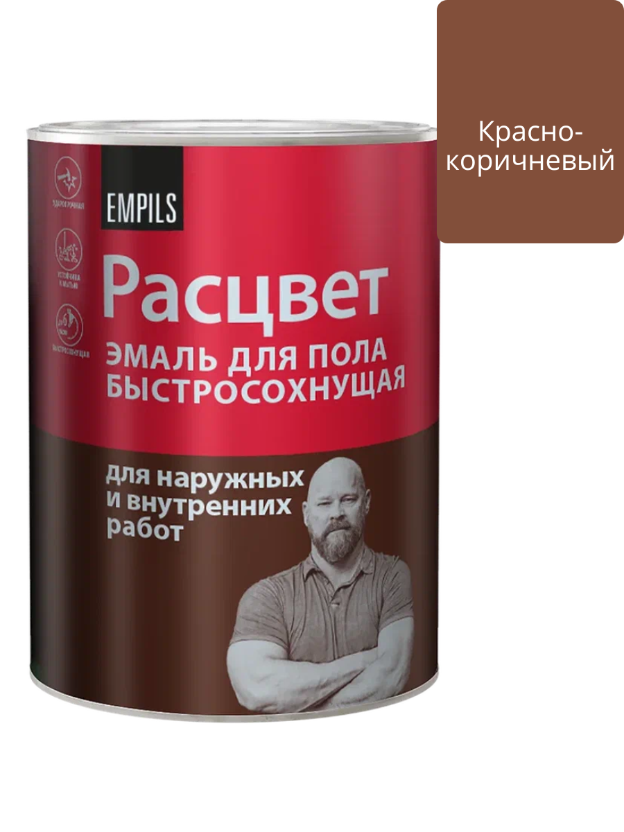 Эмаль для пола быстросохнущая Красно-коричневая 0,9кг Расцвет предназначена для покрытия ранее окрашенных или неокрашенных деревянных и бетонных полов и других поверхностей с повышенной механической нагрузкой, возникающей в процессе эксплуатации (бетон, кирпич, металл, дерево, ДСП, ДВП и т.д.). Подходит для окраски полов, плинтусов, террас, ступеней и т. д.