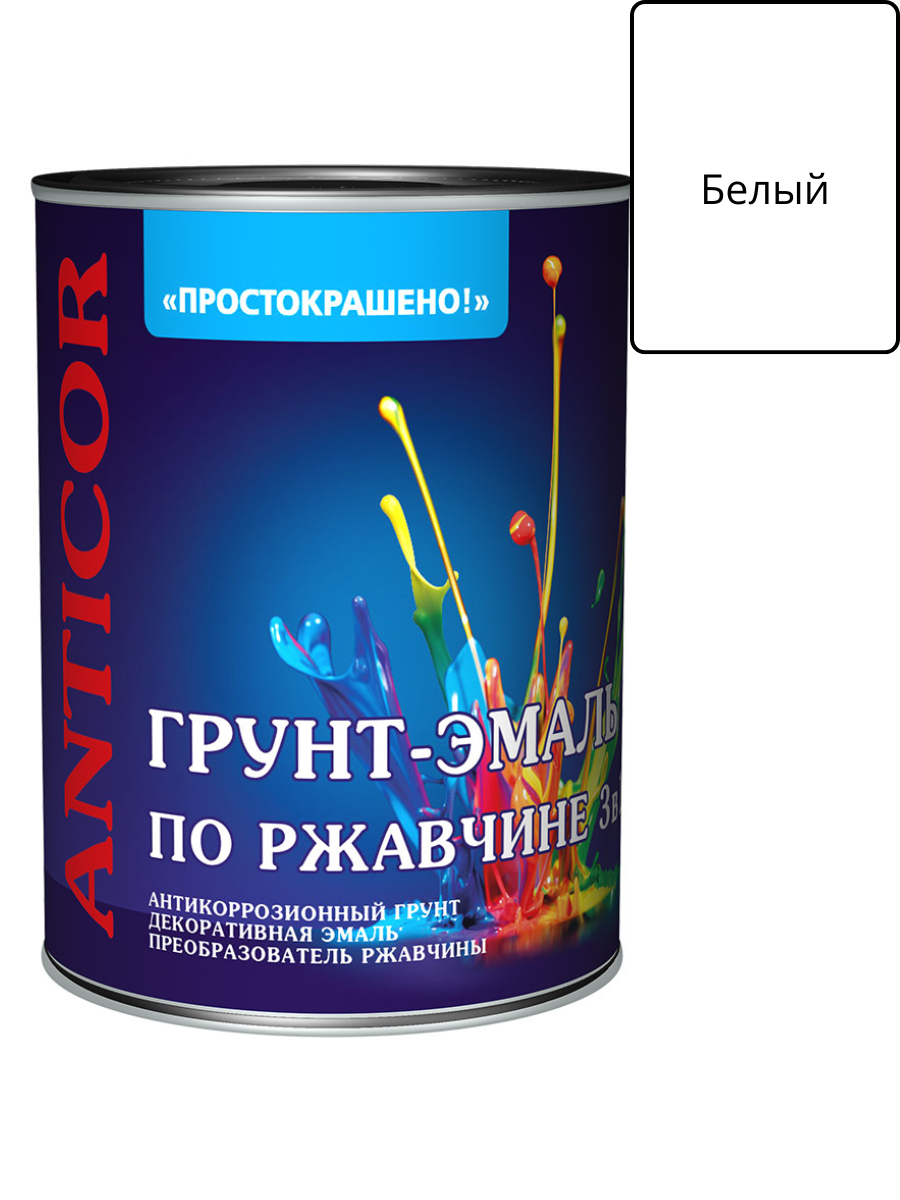 Грунт-эмаль по ржавчине 3в1 белый 0.8 кг глянцевый ПРОСТОКРАШЕНО! применяется для окрашивания поверхностей, эксплуатируемых в атмосферных условиях и внутри помещений: металлических, как чистых, так и ржавых или частично прокорродировавших с остатками окалины и плотно держащейся ржавчины толщиной до 100 мкм; а также деревянных и минеральных.