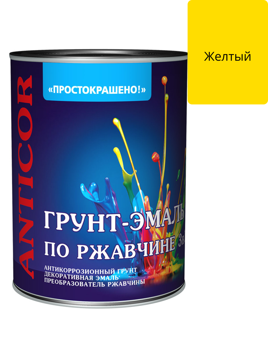Грунт-эмаль по ржавчине 3в1 желтый 0.8 кг глянцевый ПРОСТОКРАШЕНО! применяется для окрашивания поверхностей, эксплуатируемых в атмосферных условиях и внутри помещений: металлических, как чистых, так и ржавых или частично прокорродировавших с остатками окалины и плотно держащейся ржавчины толщиной до 100 мкм; а также деревянных и минеральных.