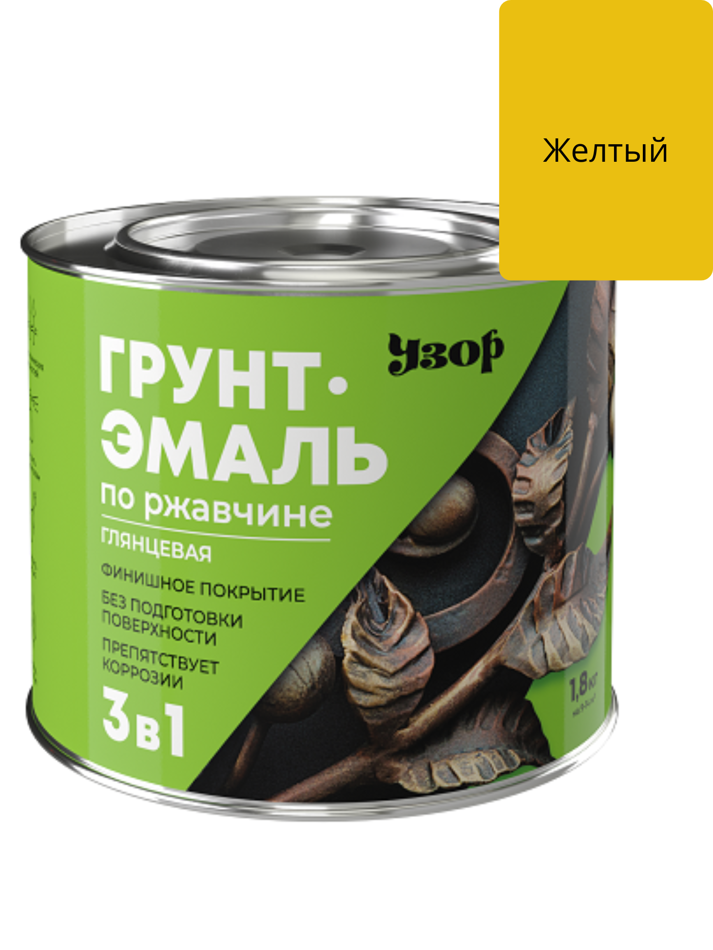 Грунт эмаль 3в1 по ржавчине, желтый глянцевый 1,8кг Узор применяется для защиты и окраски металлических, деревянных и других поверхностей, эксплуатируемых как снаружи, так и внутри помещений. После высыхания образует однородное гладкое покрытие, стойкое к мытью к истиранию, воздействию воды, растворов моющих средств, хлористого натрия.