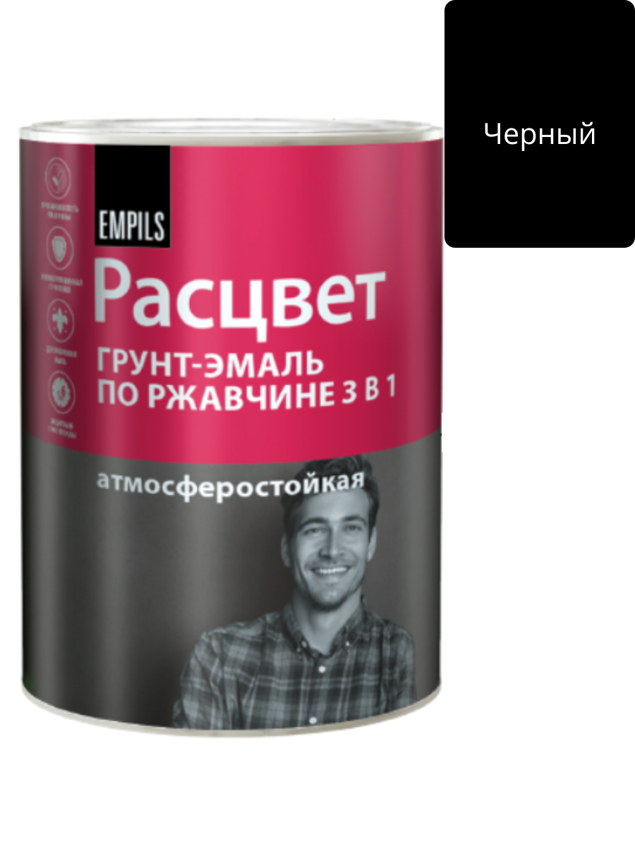 Грунт Эмаль по ржавчине 3в1 Черный 0,9кг Расцвет применяется для окрашивания поверхностей эксплуатируемых снаружи и внутри помещений: металлических, как чистых, так и ржавых или частично прокорродировавших с остатками окалины и плотно держащейся ржавчины толщиной до 0,1 мм. Также подходит для окрашивания деревянных и минеральных поверхностей.