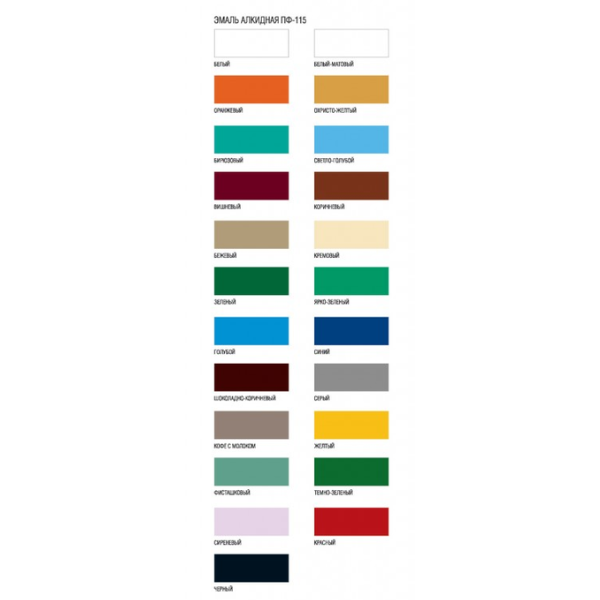 Состав: пентафталевый лак, светопрочные пигменты, микронизированный мрамор, уайтспирит, сиккатив, целевые добавки. Для матовых эмалей - микронизированный тальк, диоксид кремния.
