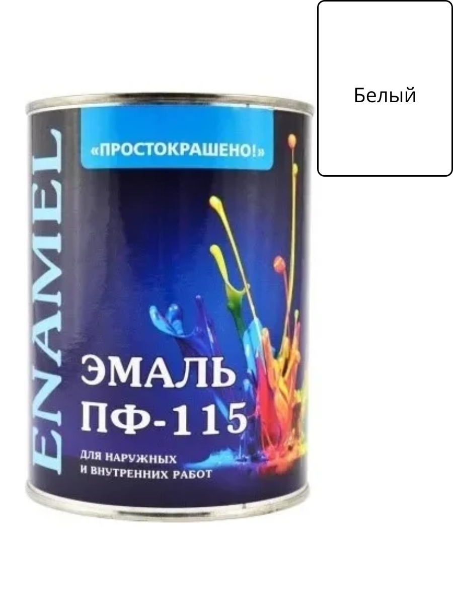 Эмаль ПФ-115 белая 0,8кг ПРОСТОКРАШЕНО! предназначена для окрашивания деревянных, металлических и других поверхностей, подвергающихся атмосферным воздействиям, и для окрасочных работ внутри помещений (оконные рамы, двери, поверхности из древесноволокнистых, древесностружечных плит и т. п.).
