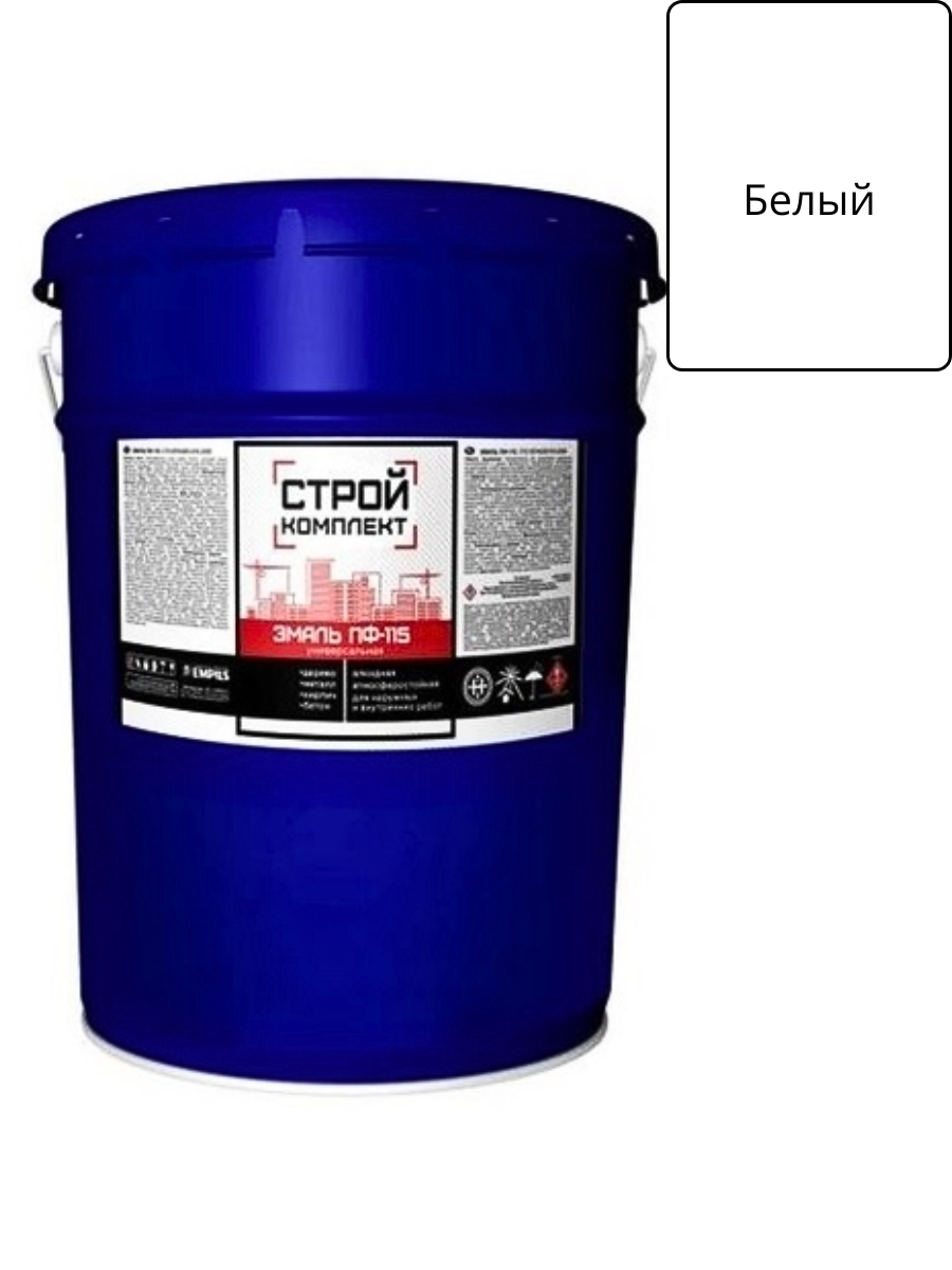 Эмаль ПФ-115 белая 20кг полуглянцевая СТРОЙКОМПЛЕКТ применяется для окрашивания деревянных, металлических и других поверхностей, подвергающихся атмосферным воздействиям, также может применяться для окрасочных работ внутри помещений (оконные рамы, двери, поверхности из древесноволокнистых, древесностружечных плит и т.п.).