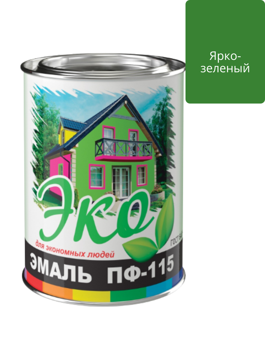 Эмаль ПФ-115 Ярко-зеленая 0,8кг ЭКО на основе алкидного лака применяется для окраски деревянных, металлических, бетонных, цементных и других поверхностей подвергающихся атмосферным воздействиям, а также для внутренних отделочных работ: окраски оконных рам, подоконников, дверей, батарей, различных деревянных и металлических предметов.