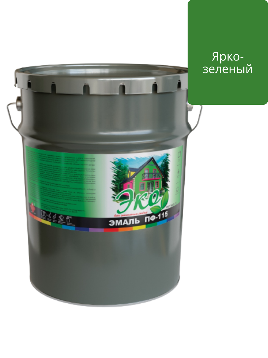 Эмаль ПФ-115 Ярко-зеленая 20кг ЭКО на основе алкидного лака применяется для окраски деревянных, металлических, бетонных, цементных и других поверхностей подвергающихся атмосферным воздействиям, а также для внутренних отделочных работ: окраски оконных рам, подоконников, дверей, батарей, различных деревянных и металлических предметов.