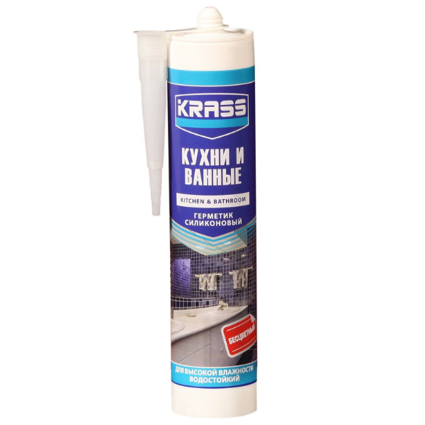 Герметик силиконовый для кухни и ванны 300мл Бесцветный KRASS применяется для герметизации в помещениях с высокой влажностью (ванные комнаты, душевые, бани, кухни), уплотнения вокруг ванн, бассейнов, умывальников, кухонных плит. Применяется для системы канализации и водоснабжения и стекольных работ. У герметика KRASS отличная адгезия к керамике, стеклу, пластику, эмали, дереву, металлу и окрашенным поверхностям. Герметик содержит высококачественный фунгицид, препятствующий гниению, образованию грибков и плесени. Устойчив к воздействию хлорированной горячей воды и моющих средств. Герметик не темнеет со временем.