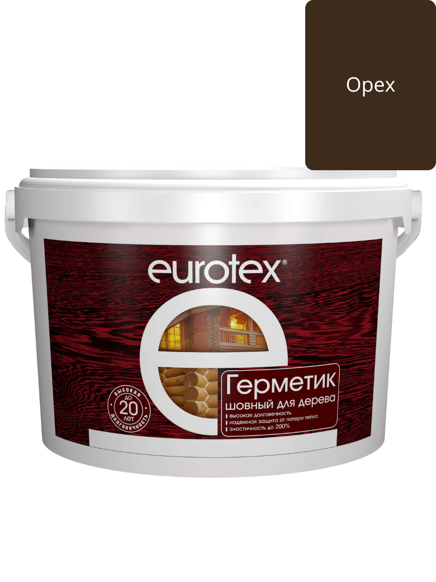 Герметик акриловый для дерева орех 3кг EUROTEX применяется внутри и снаружи помещений по деревянным поверхностям и материалам на основе древесины (ДВП, ДСП, фанера и др.). Допускается использование для герметизации стыков сборных бетонных, газобетонных и кирпичных конструкций при соблюдении технологии нанесения. Используется для герметизации межвенцовых и монтажных швов и щелей в различных деревянных конструкциях, герметизации различных трещин (торцевых, боковых) в бревнах и брусе, герметизации оконных и дверных рам, плинтусов, наличников, переплетов и пр.