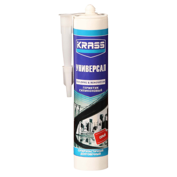 Герметик силиконовый универсальный 300мл серый KRASS применяется для заполнения щелей между строительными материалами и элементами отделки при внутренних и наружных работах в строительстве, автомобильной и судостроительной промышленности. Используется для работ по остеклению (теплицы, лоджии, балконы, витрины, зимние сады, световые табло и щиты), а также для изоляции электрической проводки. Герметик обладает превосходной адгезией к стеклу, дереву, керамике, эмали, пластикам. Герметик универсальный выдерживает большие деформации шва и даёт минимальную усадку шва, который не темнеет со временем, устойчив к атмосферным воздействиям, UV лучам и воздействию средств очистки. Удобно наносится, не растекается, быстро высыхает и обладает высокой эластичностью после затвердения.