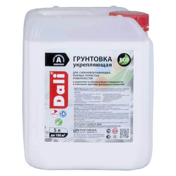 Грунтовка укрепляющая 5л. DALI применяется для подготовки поверхности к последующему нанесению отделочных материалов. Внутри и снаружи помещений по нормально и сильно впитывающим основаниям (минеральным, ГКЛ, ГВЛ, ДВП, ДСП, МДФ и пр.), в том числе ранее окрашенным и мелящим. Грунтовка Dali укрепляет пористые сильновпитывающие поверхности, повышает адгезию и снижает расход финишных покрытий, повышает качество и увеличивает срок службы финишных покрытий. Выравнивает впитывающую способность основания, обеспыливает поверхность, образует паропроницаемое («дышащее») покрытие, быстро сохнет и не имеет неприятного запаха.