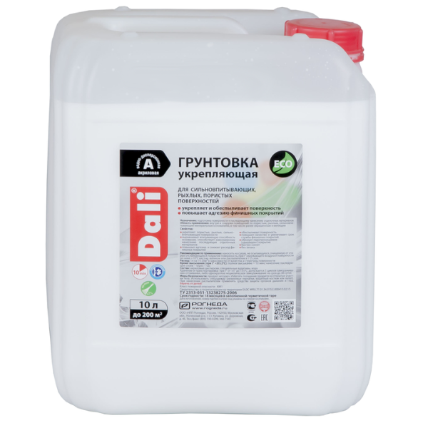 Грунтовка укрепляющая 10л. DALI применяется для подготовки поверхности к последующему нанесению отделочных материалов. Внутри и снаружи помещений по нормально и сильно впитывающим основаниям (минеральным, ГКЛ, ГВЛ, ДВП, ДСП, МДФ и пр.), в том числе ранее окрашенным и мелящим. Грунтовка Dali укрепляет пористые сильновпитывающие поверхности, повышает адгезию и снижает расход финишных покрытий, повышает качество и увеличивает срок службы финишных покрытий. Выравнивает впитывающую способность основания, обеспыливает поверхность, образует паропроницаемое («дышащее») покрытие, быстро сохнет и не имеет неприятного запаха.