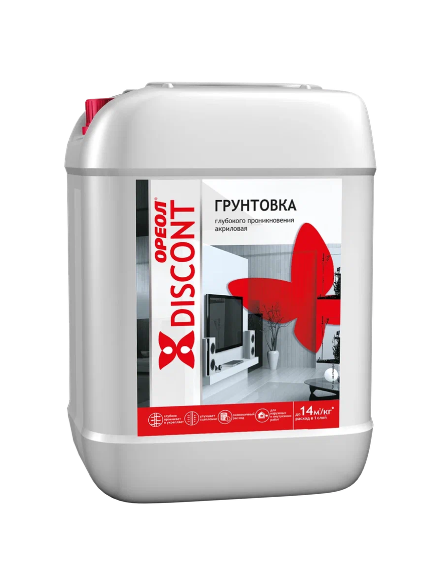 Грунтовка глубокого проникновения универсальная 10л ОРЕОЛ ДИСКОНТ применяется для пропитки и грунтования поверхностей из гипсолита, гипсокартона, бетона, кирпича, асбоцемента, древесины и пенопласта, оштукатуренных, ранее окрашенных, но не глянцевых поверхностей, других пористых поверхностей (кроме металлических), эксплуатируемых снаружи и внутри помещений.