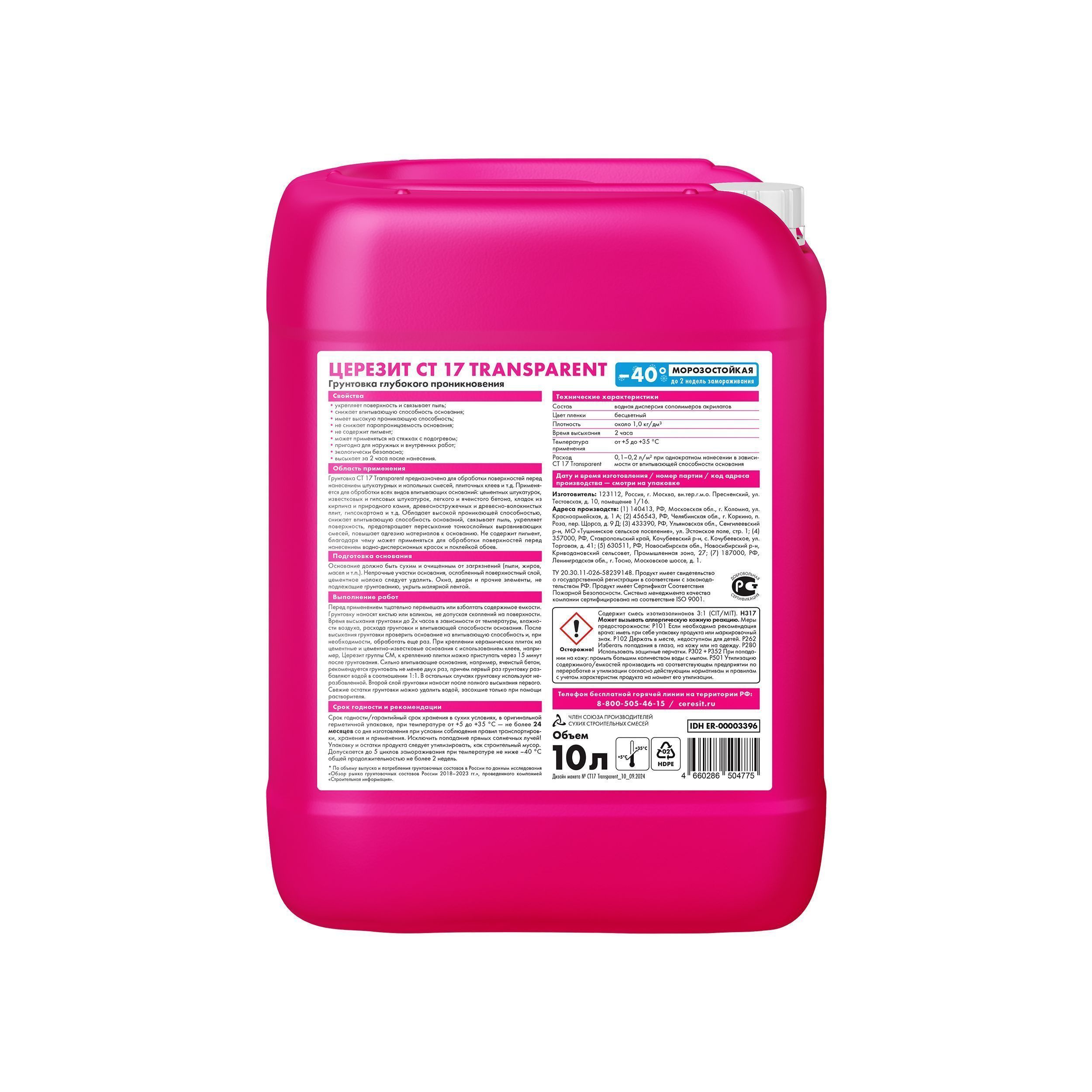 Грунтовка Церезит СТ-17 Transparent морозостойкая бесцветная 10л, арт. 3040024, (на поддоне 60шт)