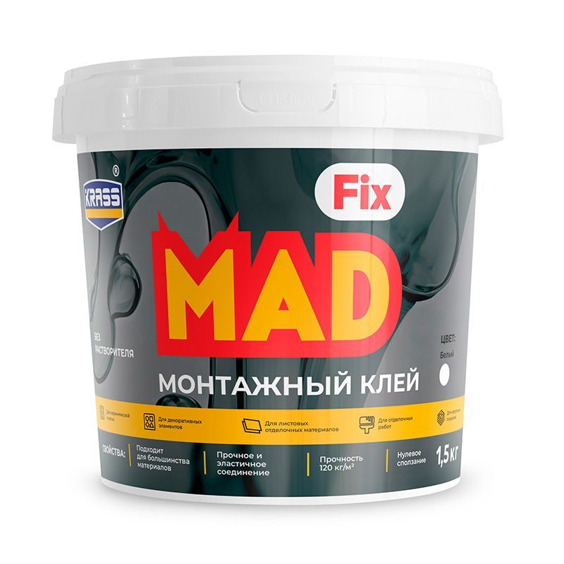 Клей монтажный универсальный MadFix Красс 1,5 кг водно-дисперсионный (жидкие гвозди) на акриловой основе предназначен для приклеивания и монтажа как тяжелых, так легких элементов и конструкций: