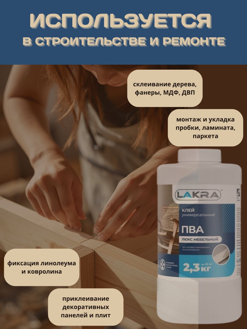 Клей ПВА "Люкс" мебельный Лакра предназначен для профессионального применения в деревообрабатывающей и полиграфической промышленности, а также для ответственных видов работ в быту, в которых предъявляются высокие требования к прочности склейки. Рекомендуется для работ, где шов склеивания подвергается большим динамическим нагрузкам. Подходит для склеивания всех пород дерева, переплетных работ. Применяется при сборке и ремонте мебели, приклеивании шпона.