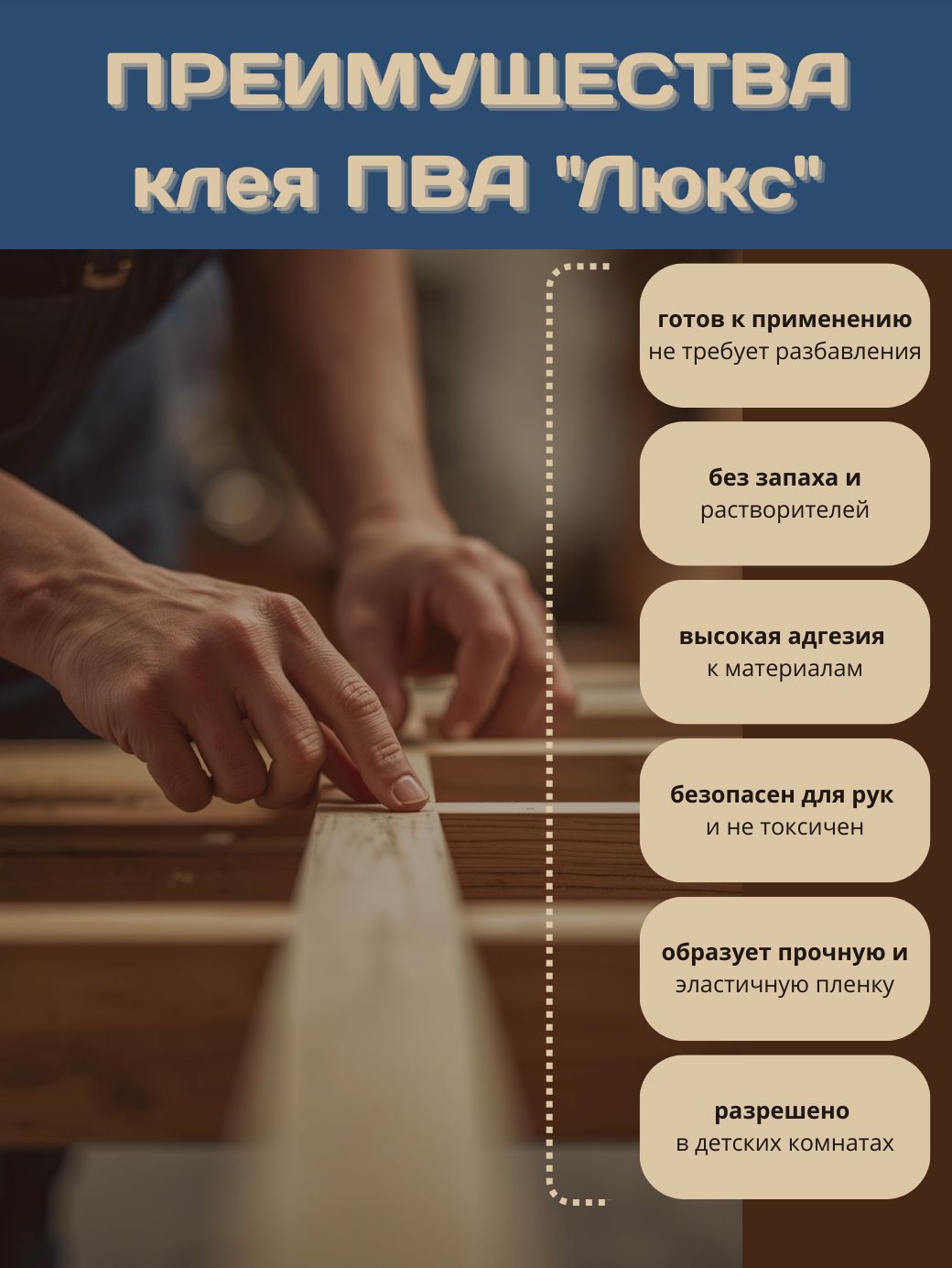 Состав: водная дисперсия ПВА, пластификатор, гидроксиэтилцеллюлоза, консервант, пеногаситель