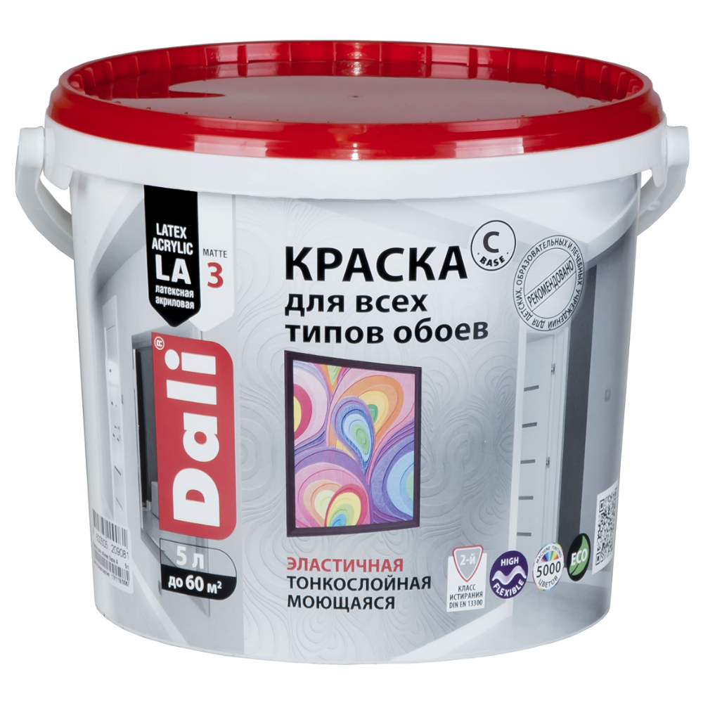 Краска ВД для обоев 5л база С (бесцветный) ДАЛИ применяется для декоративного окрашивания любых типов обоев, а также стен, и потолков в жилых и общественных помещениях с повышенной эксплуатационный нагрузкой. Внутри помещений: по всем видам обоев под покраску (структурные, бумажные, флизелиновые, стеклообои и пр.), по минеральным поверхностям (бетон, кирпич, гипс, цемент, гипсокартон, шпатлевка, штукатурка и др.) Предназначена для смешивания с пигментными концентратами с целью получения желаемого цвета. Разрешена к применению в детских, дошкольных, лечебных и общеобразовательных учреждениях. Образует глубокоматовое шелковистое покрытие, устойчивое к истиранию