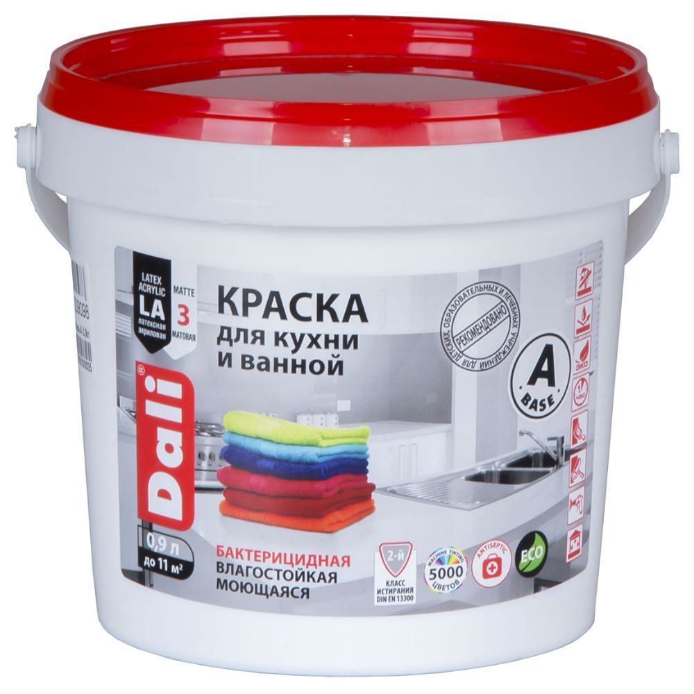 Краска ВД для кухни и ванной 0,9л база А (белый) ДАЛИ применяется для декоративное окрашивание стен и потолков в жилых и общественных помещениях с повышенной влажностью воздуха и эксплуатационной нагрузкой (кухни, санузлы, ванные, лоджии, балконы, предбанники и пр.) предназначена для смешивания с пигментными концентратами с целью получения желаемого цвета.