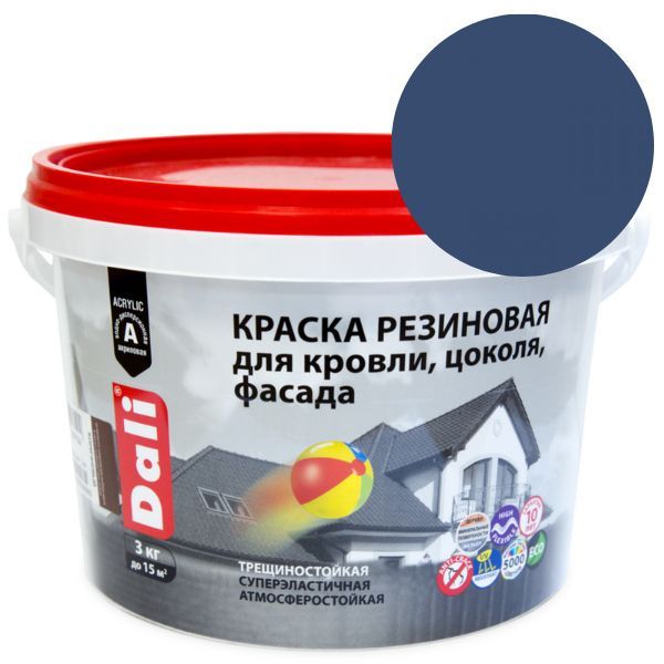 Краска ВД фасадная резиновая 3 кг синяя (RAL 5000) ДАЛИ применяется для защитно-декоративного окрашивания крыш, фасадов, цоколя зданий и сооружений, требующих долговременной эксплуатации и подверженных образованию трещин, а также для декоративного окрашивания стен и потолков в жилых и общественных помещениях с повышенной влажностью воздуха или неотапливаемых. Применяется внутри и снаружи помещений по минеральным поверхностям (шифер волнистый и плоский, черепица цементно-песчаная, бетонные изделия, кирпич, цементно-стружечные плиты, асбестоцементные плиты, фиброцементные плиты, цементно-песчаные штукатурки, гипсокартон), по различным конструкциям (панели, модули) из воздушно-сухой древесины, ОСБ, ДСП, ДВП применяемых при строительстве каркасно-панельных и модульных домов, по оцинкованной стали, загрунтованным металлическим поверхностям, по искусственной черепице.