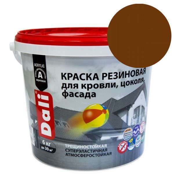 Краска ВД фасадная резиновая 6 кг терракотовая ДАЛИ применяется для защитно-декоративного окрашивания крыш, фасадов, цоколя зданий и сооружений, требующих долговременной эксплуатации и подверженных образованию трещин, а также для декоративного окрашивания стен и потолков в жилых и общественных помещениях с повышенной влажностью воздуха или неотапливаемых. Применяется внутри и снаружи помещений по минеральным поверхностям (шифер волнистый и плоский, черепица цементно-песчаная, бетонные изделия, кирпич, цементно-стружечные плиты, асбестоцементные плиты, фиброцементные плиты, цементно-песчаные штукатурки, гипсокартон), по различным конструкциям (панели, модули) из воздушно-сухой древесины, ОСБ, ДСП, ДВП применяемых при строительстве каркасно-панельных и модульных домов, по оцинкованной стали, загрунтованным металлическим поверхностям, по искусственной черепице.