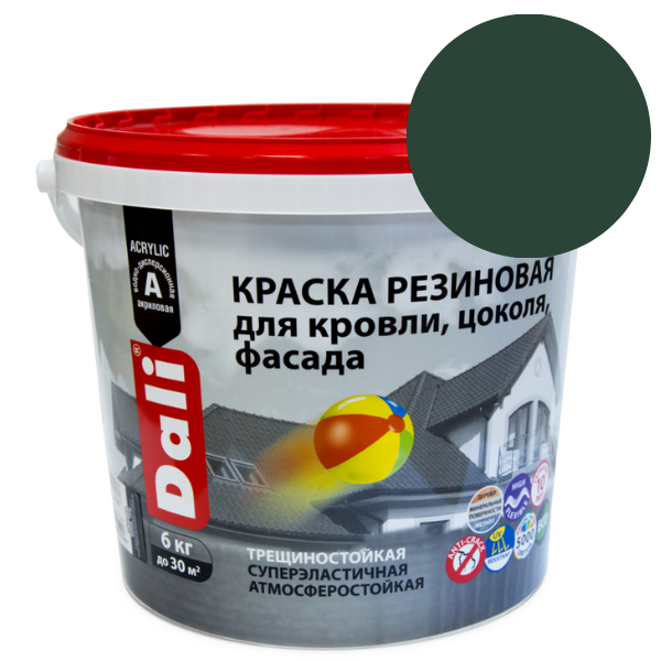 Краска ВД фасадная резиновая 6 кг зеленая ДАЛИ применяется для защитно-декоративного окрашивания крыш, фасадов, цоколя зданий и сооружений, требующих долговременной эксплуатации и подверженных образованию трещин, а также для декоративного окрашивания стен и потолков в жилых и общественных помещениях с повышенной влажностью воздуха или неотапливаемых. Применяется внутри и снаружи помещений по минеральным поверхностям (шифер волнистый и плоский, черепица цементно-песчаная, бетонные изделия, кирпич, цементно-стружечные плиты, асбестоцементные плиты, фиброцементные плиты, цементно-песчаные штукатурки, гипсокартон), по различным конструкциям (панели, модули) из воздушно-сухой древесины, ОСБ, ДСП, ДВП применяемых при строительстве каркасно-панельных и модульных домов, по оцинкованной стали, загрунтованным металлическим поверхностям, по искусственной черепице.