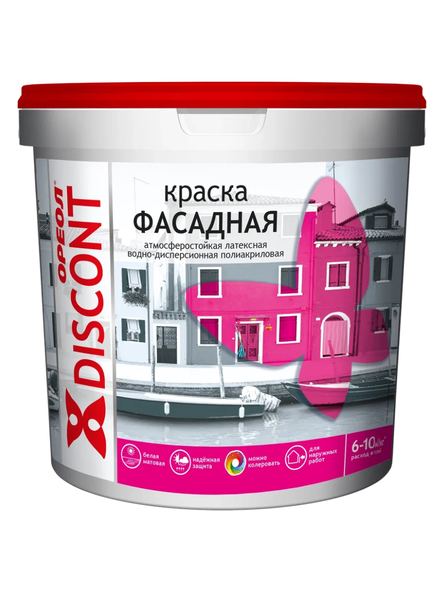 Краска ВД фасадная 1,5кг матовая белая ОРЕОЛ ДИСКОНТ применяется для окрашивания наружных поверхностей жилых и административных зданий. Краску можно наносить на бетонные, кирпичные, оштукатуренные, деревянные и другие пористые поверхности, подвергающиеся атмосферным воздействиям.