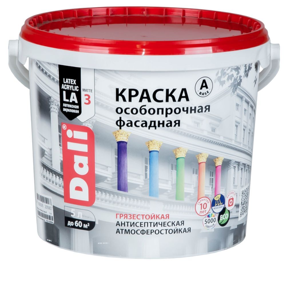 Краска ВД фасадная особопрочная 5л база А (белый) ДАЛИ применяется для декоративного окрашивания фасадов зданий и сооружений, требующих долговременной эксплуатации, а также для декоративного окрашивания стен и потолков в жилых и общественных неотапливаемых помещениях, помещениях с повышенной или переменной влажностью воздуха, помещениях с высокой эксплуатационной нагрузкой. Предназначена для смешивания с пигментными концентратами с целью получения желаемого цвета. Снаружи и внутри помещений по минеральным поверхностям (бетон, кирпич, гипс, цемент, гипсокартон, шпатлевка, штукатурка и др.) Образует влагостойкое глубокоматовое шелковистое покрытие, устойчивое к истиранию и механическим воздействиям и обладает повышенной стойкостью к загрязнениям, выдерживает влажную очистку фасадов с применением моющих средств и специальной техники. Краска содержит активный антисептик, обеспечивает надежную защиту от плесени и грибка, устойчива к воздействию УФ-излучения, не выгорает, не желтеет и не теряет цвет в процессе эксплуатации