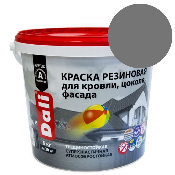 Краска ВД фасадная резиновая 6 кг серая ДАЛИ применяется для защитно-декоративного окрашивания крыш, фасадов, цоколя зданий и сооружений, требующих долговременной эксплуатации и подверженных образованию трещин, а также для декоративного окрашивания стен и потолков в жилых и общественных помещениях с повышенной влажностью воздуха или неотапливаемых. Применяется внутри и снаружи помещений по минеральным поверхностям (шифер волнистый и плоский, черепица цементно-песчаная, бетонные изделия, кирпич, цементно-стружечные плиты, асбестоцементные плиты, фиброцементные плиты, цементно-песчаные штукатурки, гипсокартон), по различным конструкциям (панели, модули) из воздушно-сухой древесины, ОСБ, ДСП, ДВП применяемых при строительстве каркасно-панельных и модульных домов, по оцинкованной стали, загрунтованным металлическим поверхностям, по искусственной черепице.