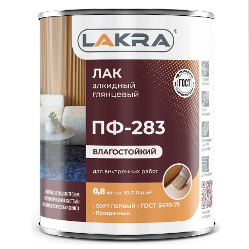 Лак алкидный ПФ-283 прозрачный Лакра образует прочное прозрачное глянцевое покрытие с высокими декоративными свойствами, подчеркивает структуру дерева. Защищает от воздействия влаги.