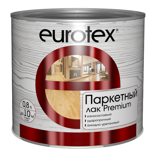 Лак паркетный глянцевый 0,8л EUROTEX PREMIUM применяется для защиты древесины (всех видов паркета и других деревянных полов, лестниц, настилов, а также любых вертикальных и горизонтальных поверхностей) от механических воздействий.