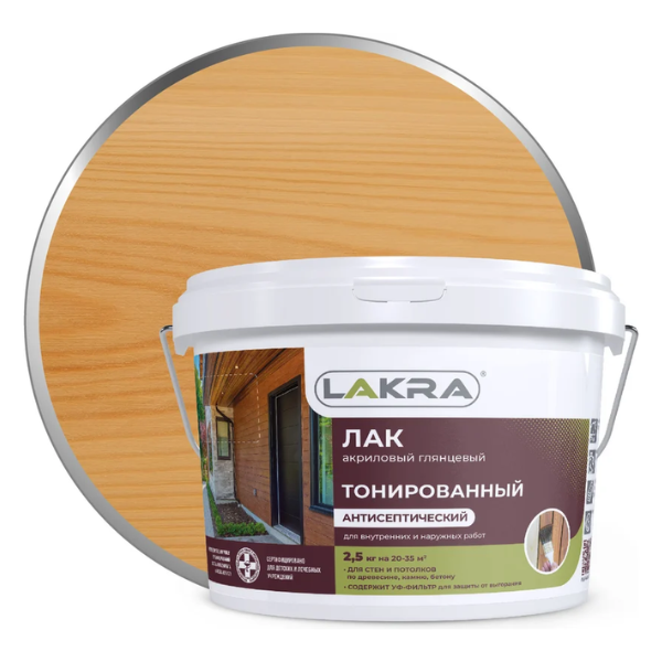 Лак в/д дуб с УФ-фильтром 2,5кг Лакра на основе водной акриловой дисперсии. Придает деревянным поверхностям красивый декоративный вид. Обладает высокой скоростью высыхания, что дает возможность окрасить поверхность в 2 слоя за одни сутки.