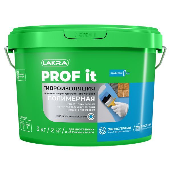 Гидроизоляция (мастика) PROF IT полимерная 3кг Лакра на основе сверхгидрофобного латекса для внутренних и наружных работ применяется для: