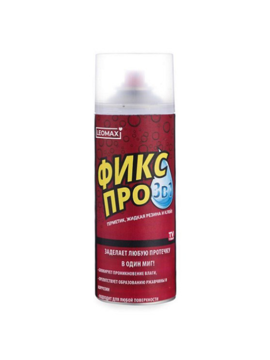 Жидкая резина ''Фикс Про 3 в 1'' прозрачного цвета – это инструмент для ремонта и строительства, водоотталкивающий спрей, который заделает любую трещину, шов или протечку за один миг. Жидкая резина - это инновационный материал, который сочетает в себе свойства герметика, резины и клея. Распылитель герметизирует любые трещины, образуя водонепроницаемое уплотнение. Водостойкий аэрозоль полностью блокирует проникновение влаги, образование ржавчины и коррозии. Фикс Про работает практически на любых поверхностях, таких как пластик, металл, дерево, плитка, камень, керамика, кирпич, бетон, стекло, резина. Он огнеупорный, не боится ни высоких, ни низких температур. Порвался шланг, прохудилась бочка, ведро, треснул стул, протекает крыша, лопнула труба или даже резиновые сапоги - все починит.