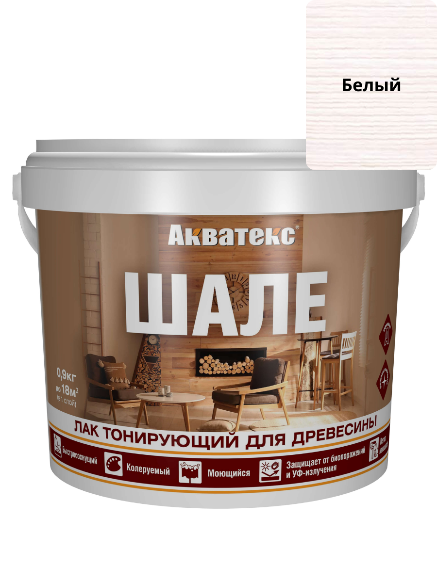 Лак тонирующий для древесины ШАЛЕ 0,9кг Белый АКВАТЕКС применяется для окраски и защиты древесины от выгорания и пожелтения, биопоражения (гниения, плесени, грибка, синевы) и загрязнений.
