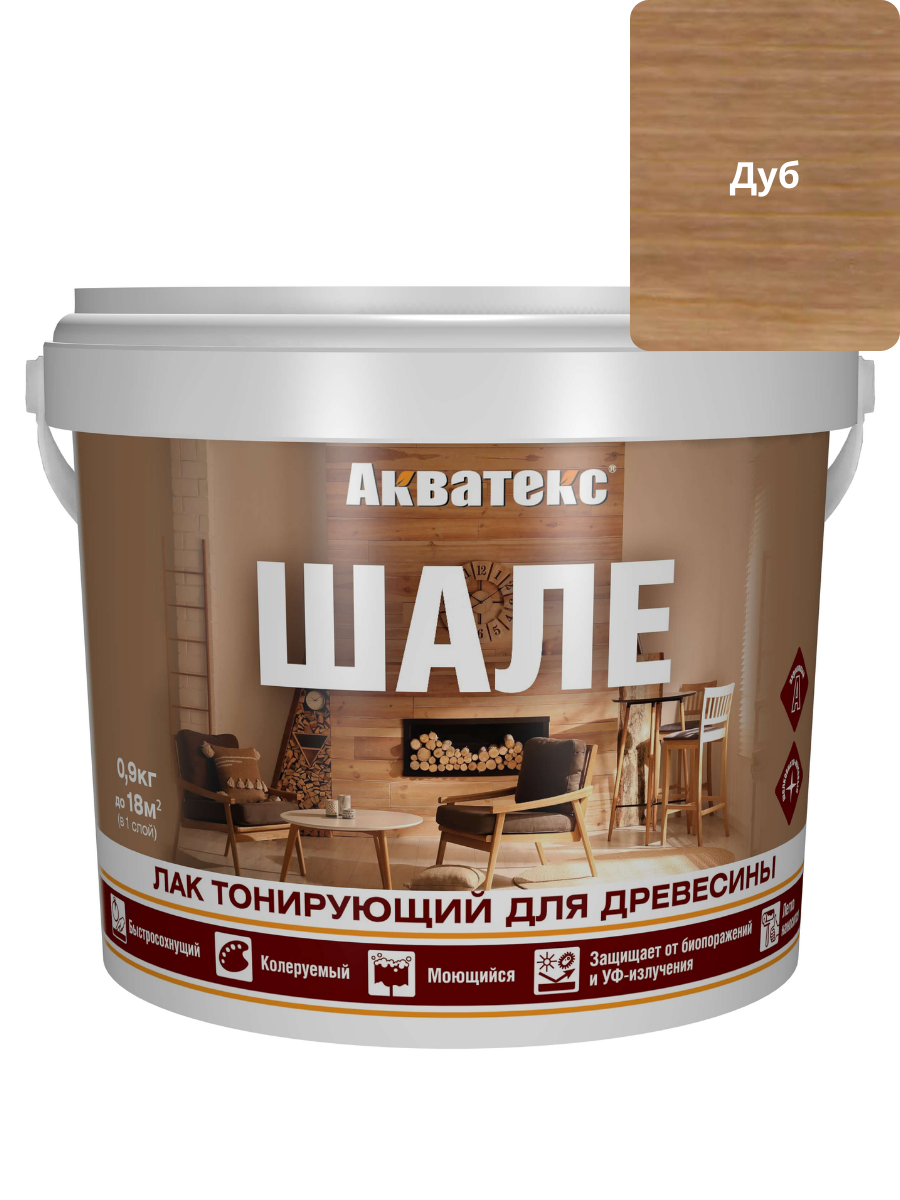 Лак тонирующий для древесины ШАЛЕ 0,9кг Дуб АКВАТЕКС применяется для окраски и защиты древесины от выгорания и пожелтения, биопоражения (гниения, плесени, грибка, синевы) и загрязнений.