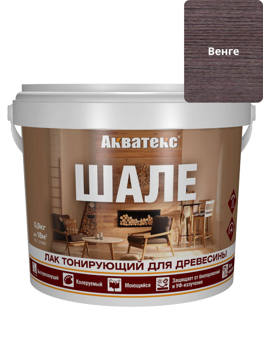 Лак тонирующий для древесины ШАЛЕ 0,9кг Венге АКВАТЕКС применяется для окраски и защиты древесины от выгорания и пожелтения, биопоражения (гниения, плесени, грибка, синевы) и загрязнений.