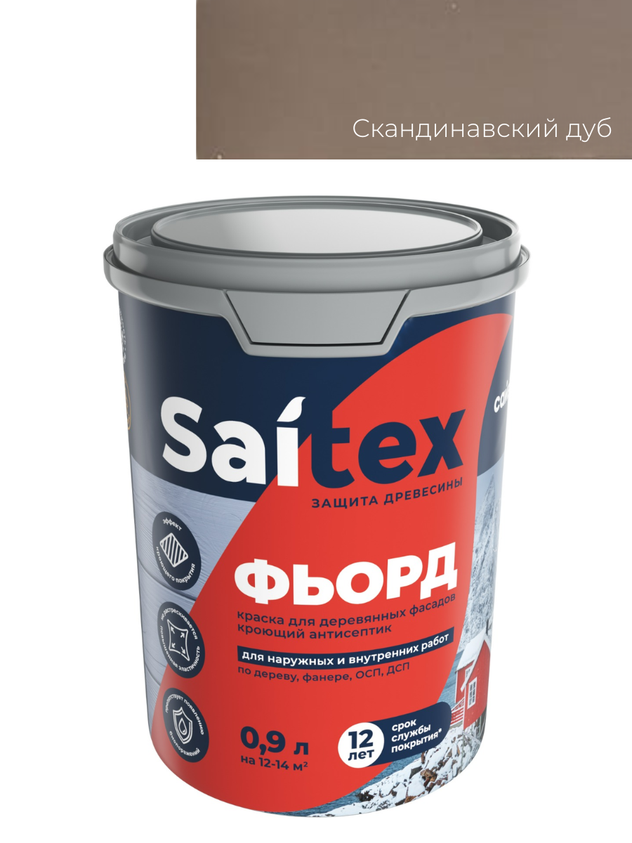 Краска для деревянных фасадов, кроющий антисептик ФЬОРД Скандинавский дуб 0,9л Сайтекс предназначен для долговременной защиты и декоративной окраски домов, беседок, заборов и других конструкций и изделий из дерева и OSB плит. Создает плотное кроющее покрытия, скрывающее рисунок, но сохраняющий видимую структуру древесины. Обеспечивает долговечное покрытие, выдерживает влажную уборку с применением моющих средств.