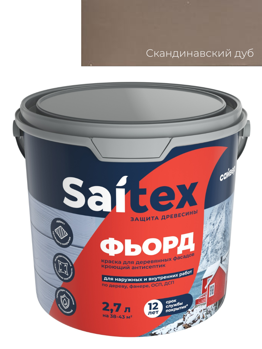 Краска для деревянных фасадов, кроющий антисептик ФЬОРД Скандинавский дуб 2,7л Сайтекс предназначен для долговременной защиты и декоративной окраски домов, беседок, заборов и других конструкций и изделий из дерева и OSB плит. Создает плотное кроющее покрытия, скрывающее рисунок, но сохраняющий видимую структуру древесины. Обеспечивает долговечное покрытие, выдерживает влажную уборку с применением моющих средств.