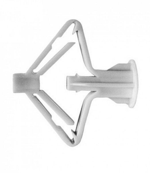 Дюбель для гипсокартона (бабочка) имеет довольно сложную конструкцию как нельзя лучше адаптированную для крепления в гипсокартоне. На верхней части дюбеля расположены по длине расположены два борта, которые предотвращают прокручивание дюбеля, а специальная конструкция образующая в процессе монтажа зонт, позволяет надежно закрепиться в гипсокартоне.