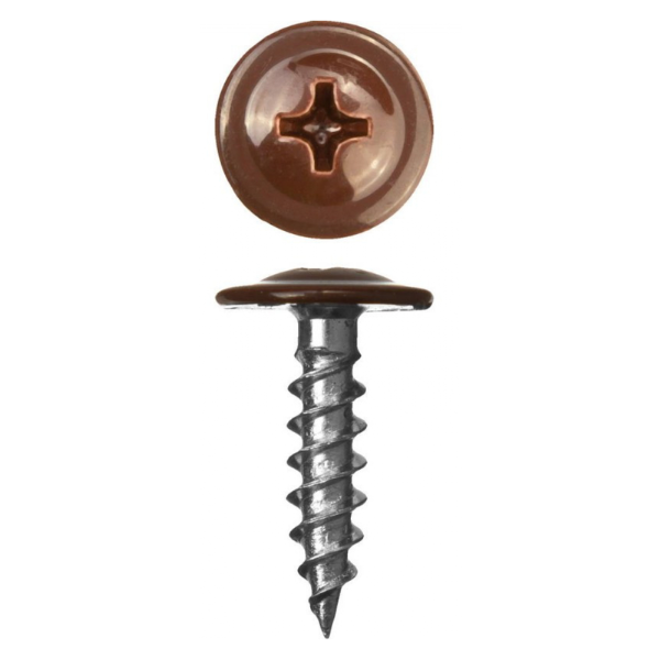 Саморез с прессшайбой остроконечный изготовлен из оцинкованной стали и окрашен по каталогу RAL 8017 Шоколад. Имеет резьбу с мелким шагом и острый конец со способностью просверливания конструкций из металла не толще 0,9 мм. Головка самореза имеет крестовидное отверстие, под головкой расположена специальная шайба, которая служит для более плотной фиксации скрепляемых материалов. Применяется для монтажных работ, для прочного крепления к гипсокартону или деревянной обрешетке листового металла, тонколистовой стали.