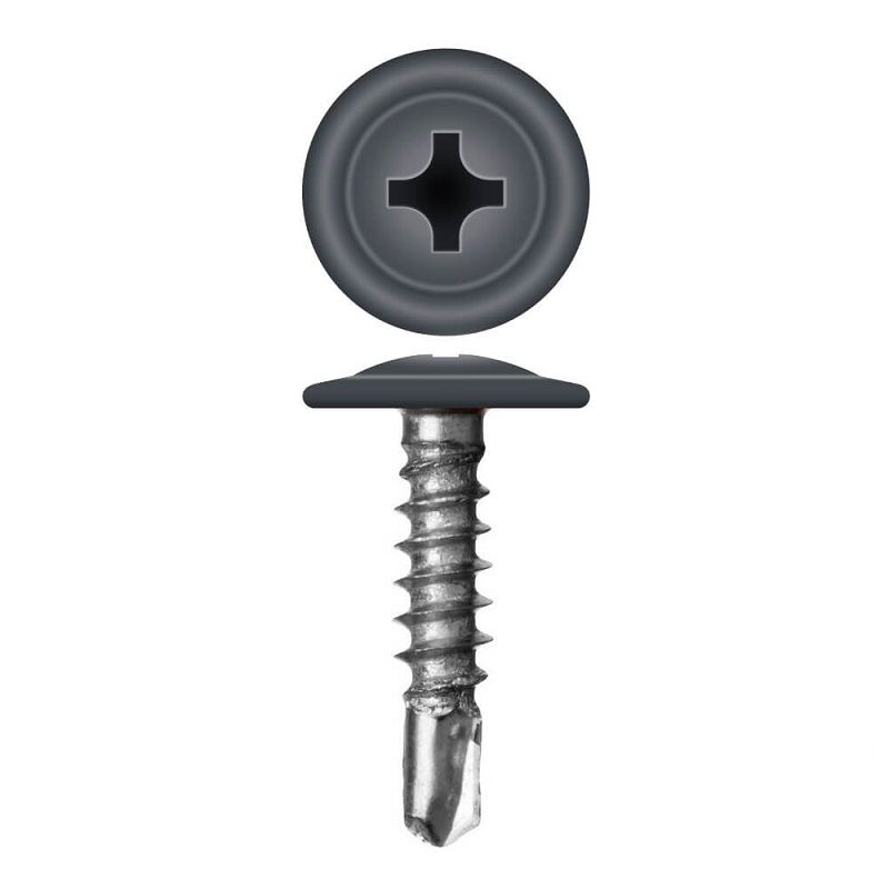 Саморез с прессшайбой сверлоконечный изготовлен из оцинкованной стали и окрашен по каталогу RAL 7024 Графит. Имеет резьбу с мелким шагом и наконечник в виде сверла, со способностью просверливания металла до 2 мм, без предварительного сверления отверстия. Головка самореза имеет крестовидное отверстие, под головкой расположена специальная шайба, которая служит для более плотной фиксации скрепляемых материалов. Применяется для монтажных работ, соединения элементов листового металла, тонколистовой стали.