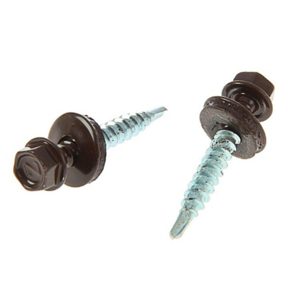 Саморез кровельный изготовлен из стали, покрыт белым цинком с дополнительной окраской в цвет RAL 8017 Шоколад. Применяется для крепления кровельных материалов, металлочерепицы или мягкой кровли и прочих к деревянному основанию. Кровельный саморез с редким шагом резьбы и уменьшенным сверлом, диаметра 4.8 для крепления кровли к дереву. Головка у саморезов под шестигранную биту, так же имеется шайба плоская с резиновой прокладкой EPDM для повышения герметизации.