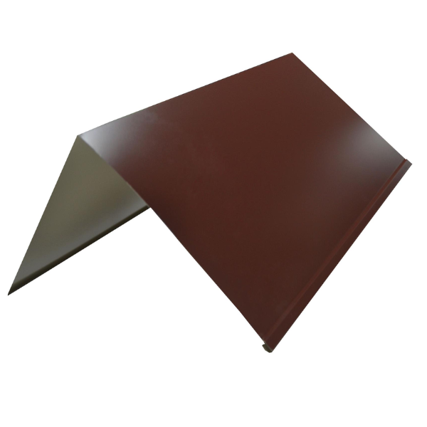 Конек с подгибом 150мм*2м RAL 8017 Шоколад применяется для закрытия профилированных листов в местах соединения скатов и наружных переломов. Используется для защиты от попадания влаги, пыли и грязи под кромки черепицы, профнастила и ондулина.