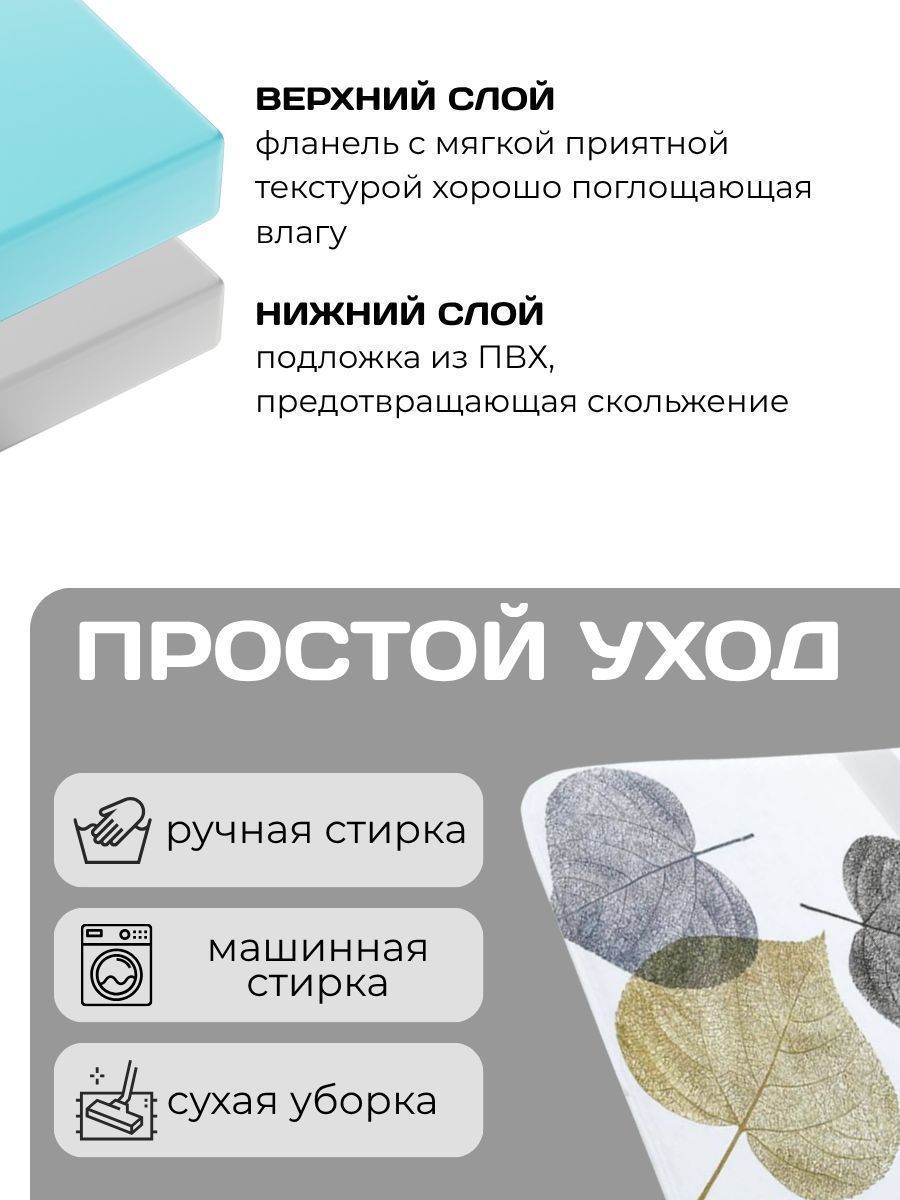 Коврик для ванной комнаты Leaf 117 Sanitaryware, размер 45х75см. изготовлен из фланели с мягкой приятной текстурой хорошо поглощающей влагу, подложка изготовлена из ПВХ, что предотвращает скольжение. Коврик не меняет свою форму и легко чистится.
