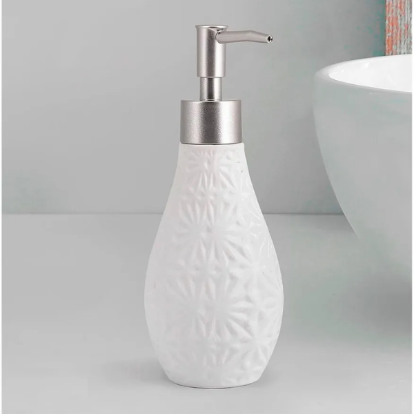 Дозатор д/жидкого мыла ВаннДерВайт, керамика, цвет белый 60714 Master House ,лагодаря эффектному сочетанию четкого геометрического узора на белой керамике и поверхности кнопки дозатора в цвете матовое серебро аксессуар гармонично впишется как в современный, так и в классический интерьер.