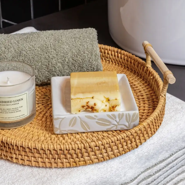 Мыльница ВаннДерЛиф, керамика, цвет белый с бежевым рисунком 60712 Master House пастельных оттенков станет прекрасным выбором для ценителей классических форм в интерьере. Растительный рисунок на керамической части дозатора выгодно отличает аксессуары коллекции Leaf.