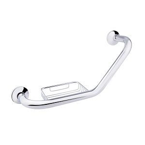 Металлический трубчатый поручень с мыльницей для ванной комнаты. Материал изделия: латунь Монтаж: настенный Цвет: хром