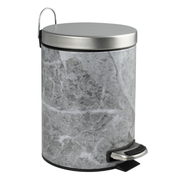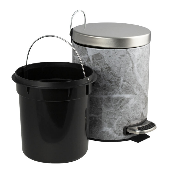 Круглое с рисунком под мрамор ведро 5 л. для хранения мусора с педалью и откидной хромированной крышкой Санакс подойдет для ванной комнаты, туалета или кухни и офиса. Ведро оснащено пластиковым гигиеническим контейнером с металлической ручкой для переноса и механизмом поднятия крышки, при помощи нажатия на педаль. Ведро изготовлено из устойчивой к коррозии нержавеющей стали с покрытием под мрамор. Нескользящая пластиковая основа ведра предотвращает повреждение пола.